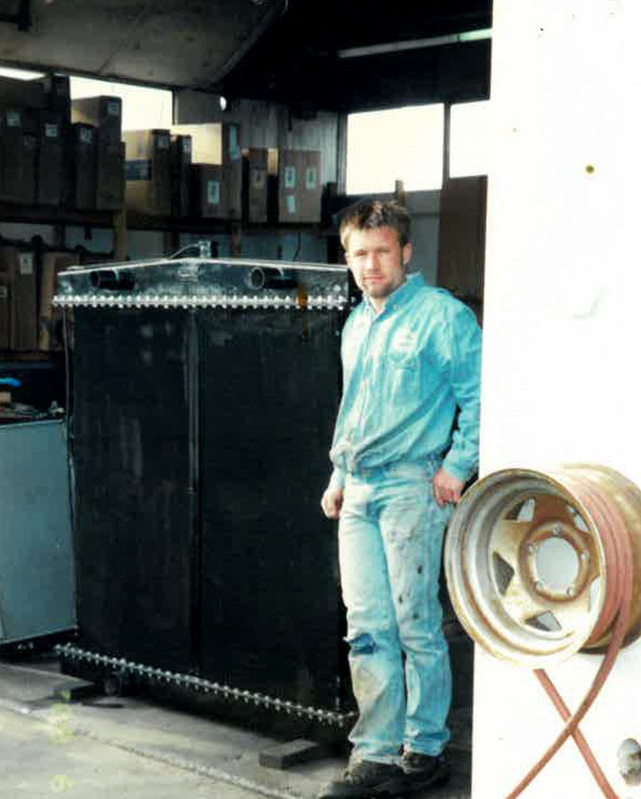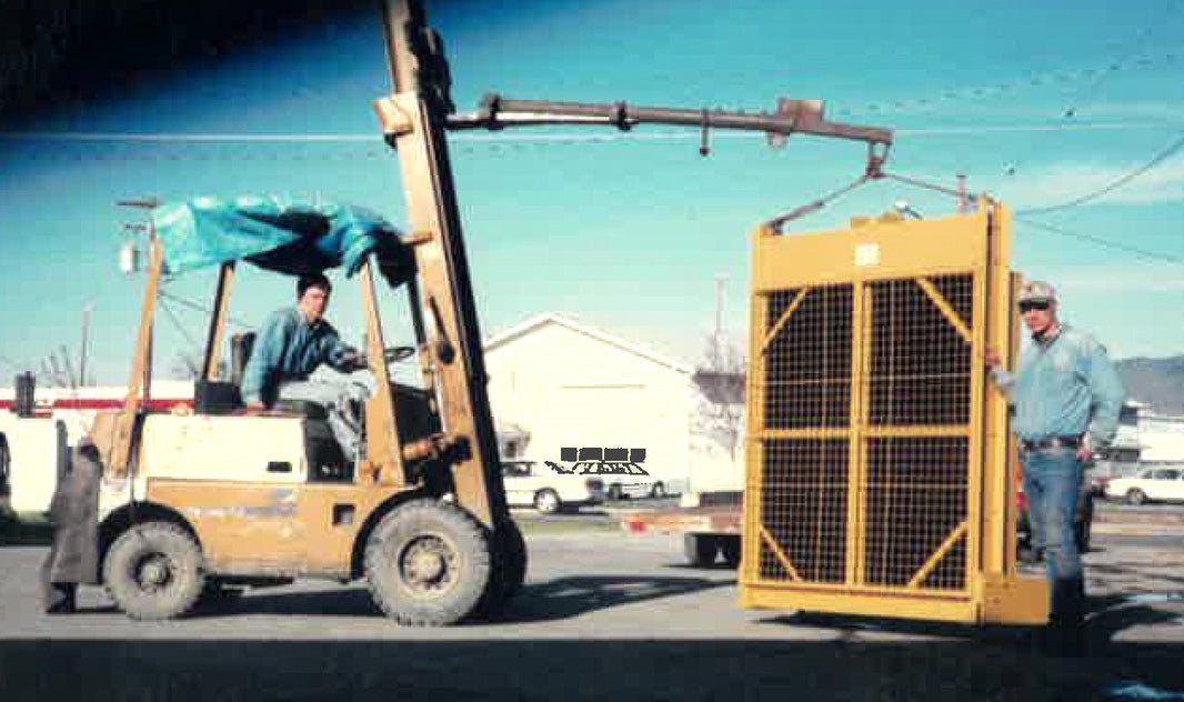 Ryan and his father Mitch Garrett with a Caterpillar gen-set radiator at the Medford Radiator shop in the late 1990's.