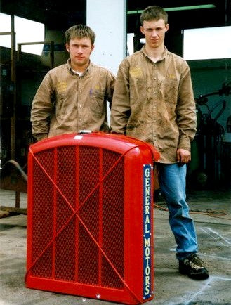 Will and Ryan Garrett showing off a General Motors gen-set radiator at their dad's shop in Medford, OR in the late 1990's.